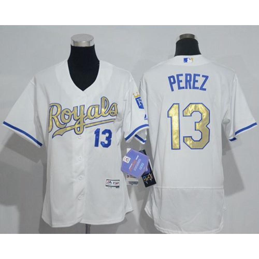 Royals #13 Salvador Perez White Flexbase Authentic 2015 World Series Champions Gold Program Cool Base Women's Stitched MLB Jersey