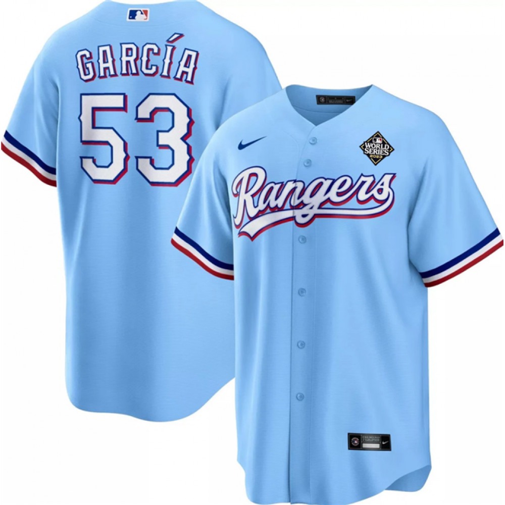 Men's Texas Rangers #53 Adolis Garcia Blue 2023 World Series Cool Base Stitched Baseball Jersey